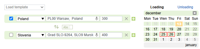 Holidays. If there are holidays in the calendar in the country of loading/unloading, they are highlighted with a red frame.