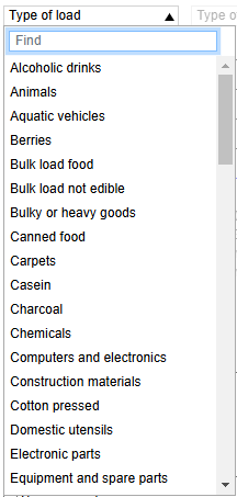 3. Cargo type. The drop-down menu displays types of cargoes.