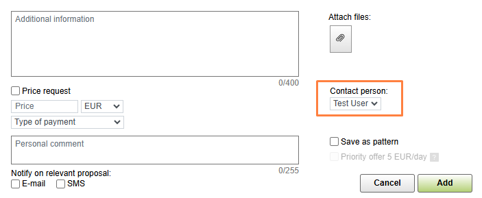 You are specified as the person to contact for this load automatically. If you edit this part and decide to specify another employee of your company (from the drop-down menu), only he or she will be able to see, edit, or delete this offer.