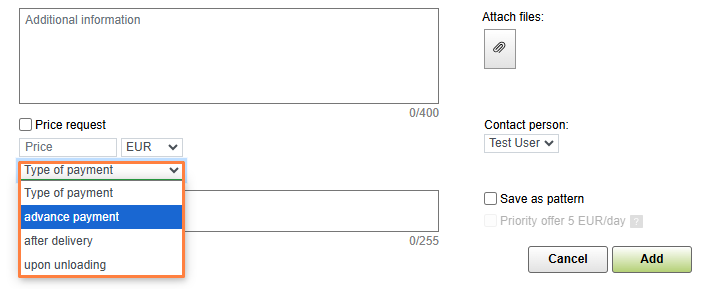 6. Type of payment. Click More options…. Select the type of payment from the available options: during unloading, after delivery or advance payment. Specify the price.