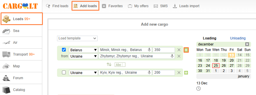 5.1. Adding load offers through the Add Load form