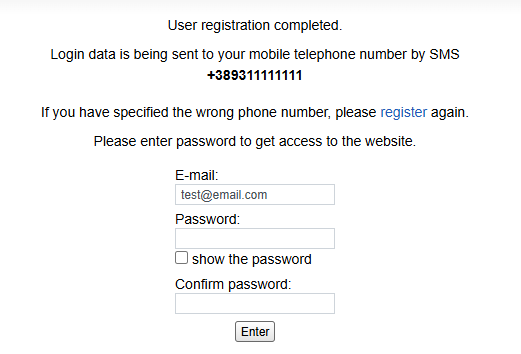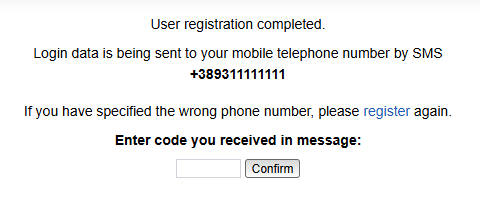 After registering you will receive a text message (SMS) with a code to the phone number that you provided during registration. Enter the code in the field shown below.