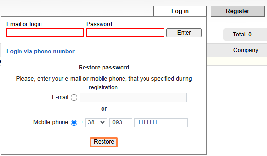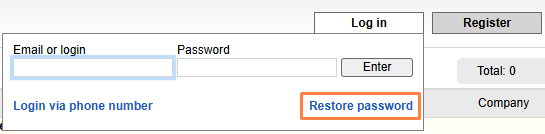 To restore a lost password, you must click on the Log In button and then press Restore Password in the newly opened window.