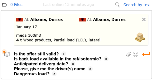 Cargo.Messenger will open. The message field will automatically be filled in with the information about the route and load or truck parameters, as well as your template phrases which are sent with the inquiry by default. Press the icon Send.