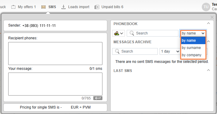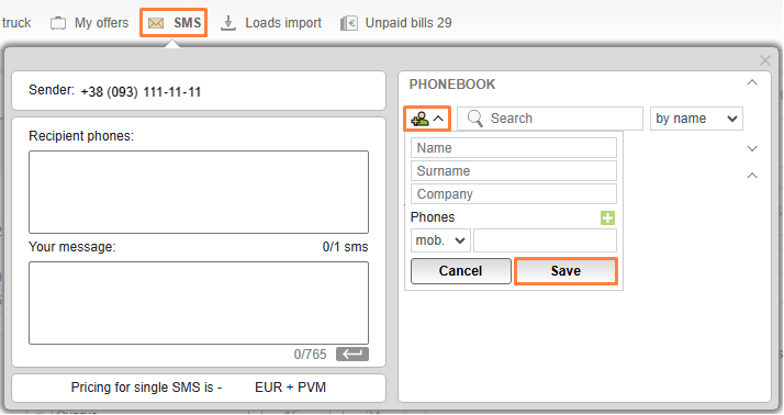 You can add the phone numbers of your colleagues, partners, drivers etc. to your phone book. To do so, click the Add to phone book icon in the PHONE BOOK drop-down menu of the SMS section, enter contact data and click Save.