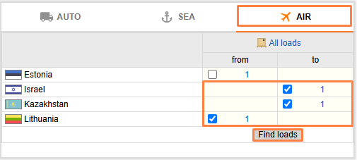 Click on the checkmark boxes indicating the location where you desire to load/unload and then click Find loads or All loads.