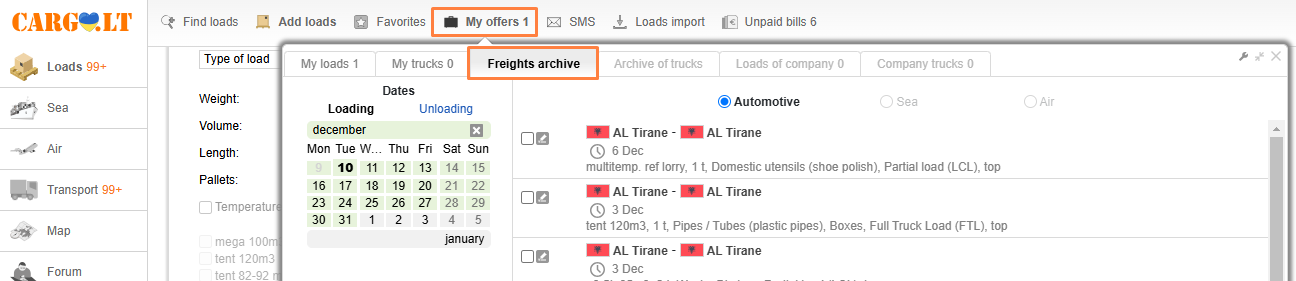 That after an offer expires, it’s transferred to the archive – Freights archive or Archive of trucks tab in the My offers section.