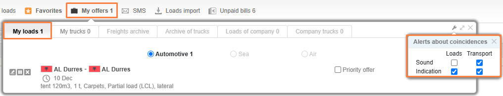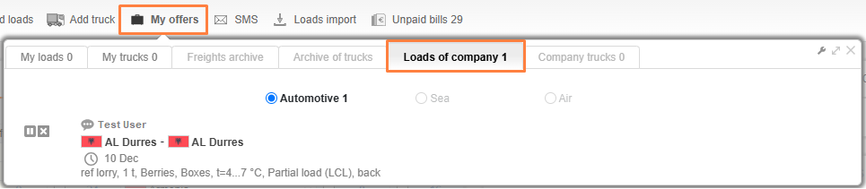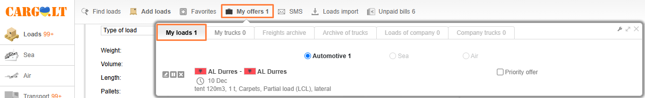 Your offers are in the My offers section, as well as in the MY OFFERS drop-down menu on the page where you add trucks or loads. It is located to the right from the adding form.