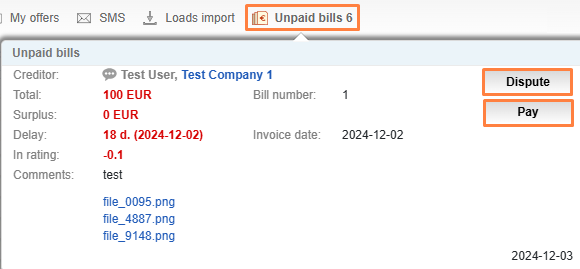 To view the current unpaid bills issued to your company, go to the Unpaid bills section on the website menu.