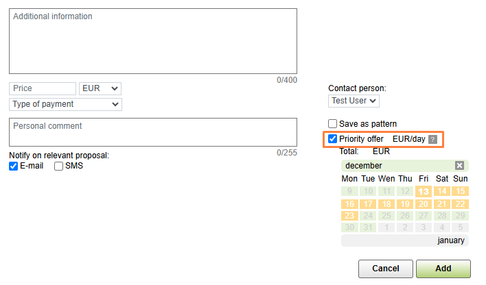 7. Priority offer. To have your offer displayed at the top of the main graph for the whole period of its relevance and highlight it for other users, select Priority offer. This is a paid service.