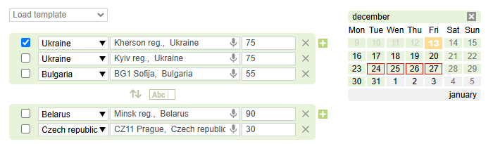 Holidays. If there are any holidays in the calendar of the loading or unloading country, they will be highlighted by a red frame.