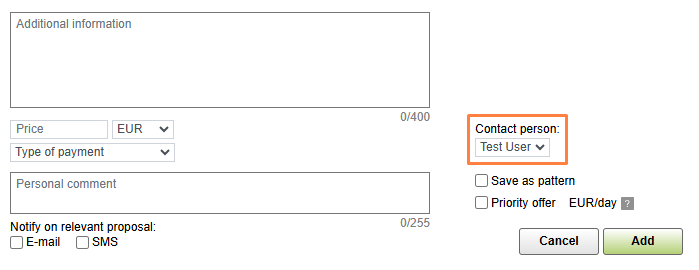 Contact person. You are specified as the person of contact automatically. If you edit this part and specify another employee of your company (from the drop-down menu), only he/she will be able to see and edit/delete this added offer.