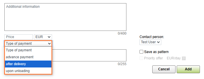 6. Type of payment. Select the type of payment from the available options: on unloading, after delivery or advance payment. Specify the price.