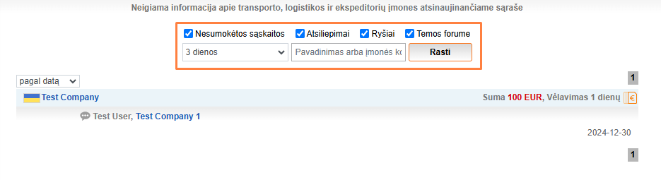 Galite rūšiuoti įvykius pagal datą arba įmonę; filtruokite pagal antraštes (neapmokėtos sąskaitos, atsiliepimai, susijusios įmonės, temos forume) laikotarpį (3 dienos, savaitė, mėnuo) ir taip pat suraskite informaciją apie konkrečią įmonę pagal jos pavadinimą ar kodą.