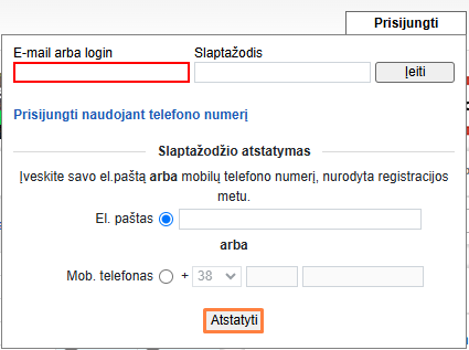 Jei slaptažodžio atkūrimo metu Jūs negaunate SMS žinutės, tuomet vietoje telefono numerio pasirinkite slaptažodžio atnaujinimą pagal el.paštą (įveskite el.paštą, kurį nurodėte registracijos metu).